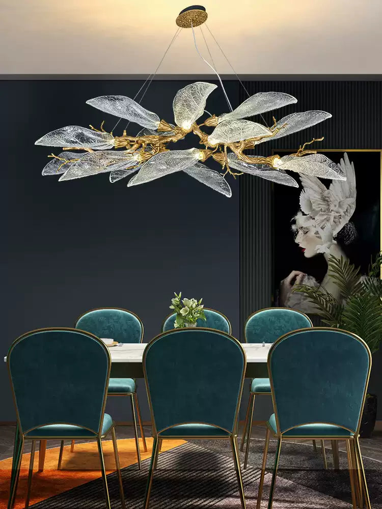 Stretching gracefully like a branch across the sky, the Rhiannon Chandelier transforms any space into a gallery of light and form. Crafted from transparent glass leaves with lifelike vein etching, this horizontal chandelier features leaves arranged along a copper spine in an elongated flow, mimicking the natural movement of wind-blown foliage.