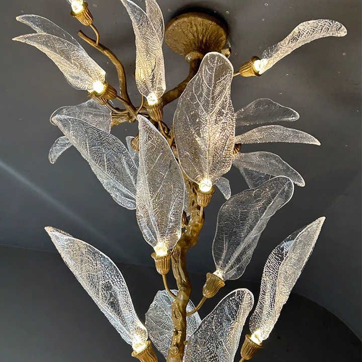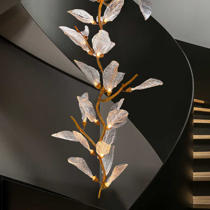 Each leaf glimmers with etched vein detail, arranged to evoke the feeling of natural descent. Whether finished in rich gold or dramatic black, this chandelier transforms vertical space into a breathtaking canvas of light.