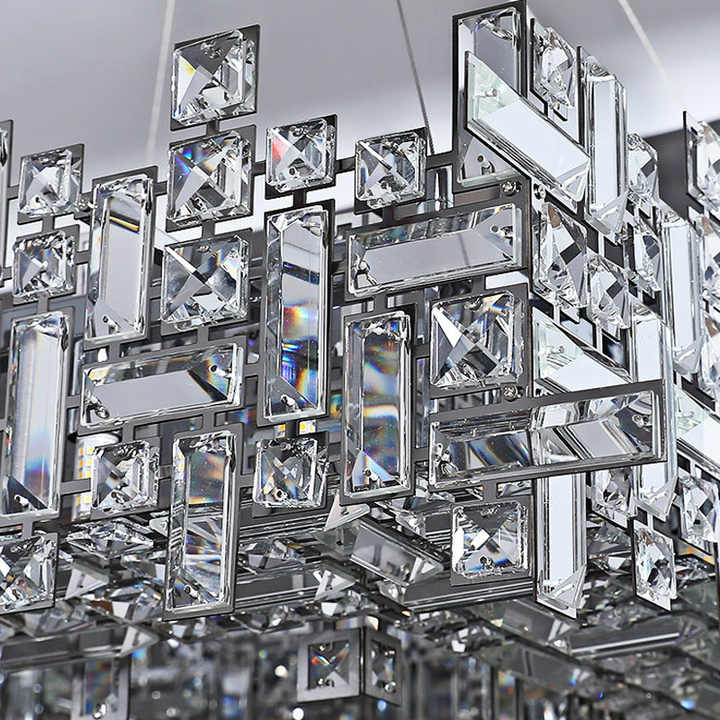 The Regalia Chandelier brings high-fashion minimalism into lighting design. With a sleek chrome finish and a unique square silhouette, this chandelier balances geometry and glamour. Shimmering glass pieces layer together within the frame, reflecting light in a cascade of silver brilliance, adding depth and dimension to any interior.